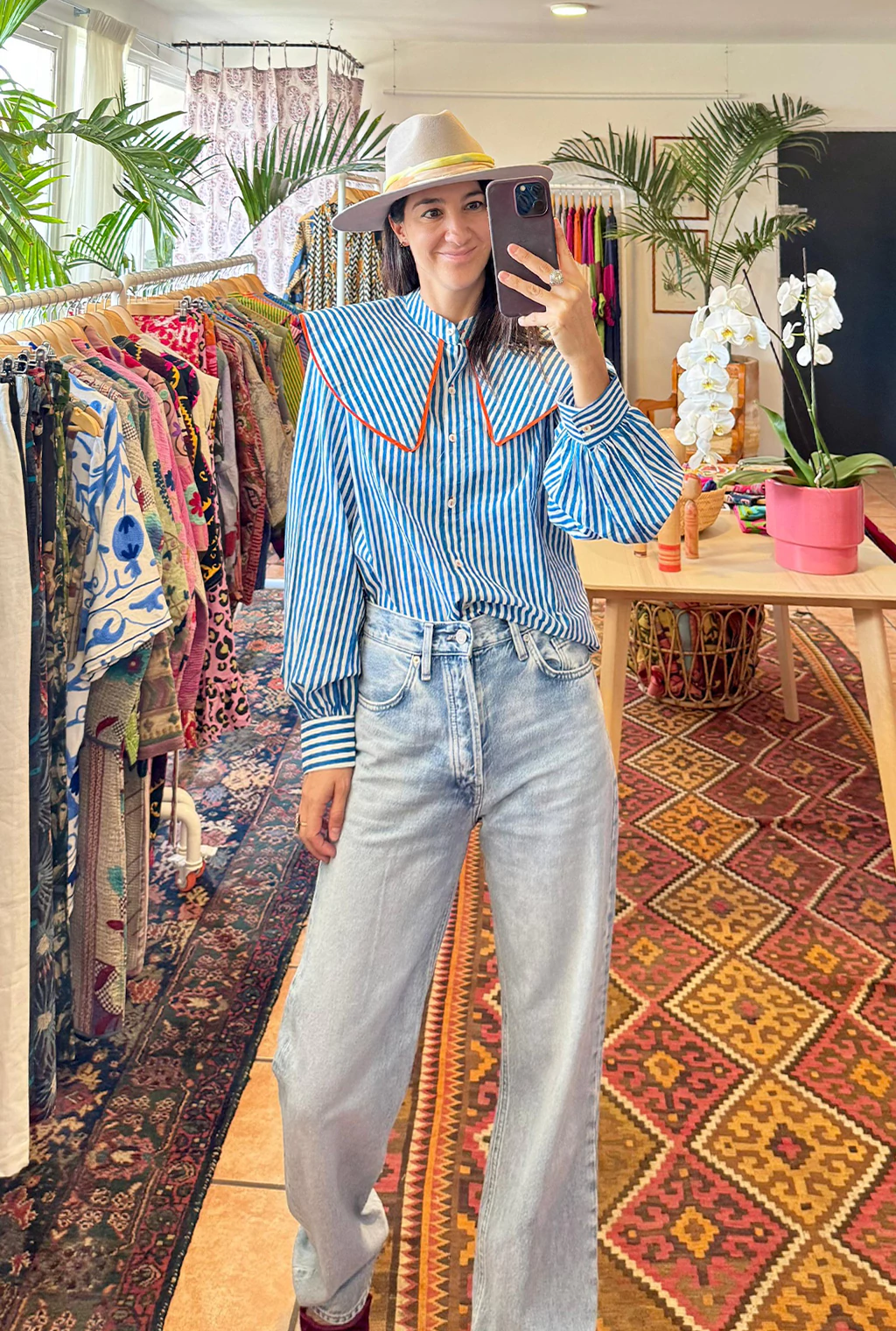 Camisa de algodón estampada a mano con la técnica del bloque a rayas de colores increíbles y su cuello ancho y el vivo y ojales en contraste la hacen una camisa muy especial.