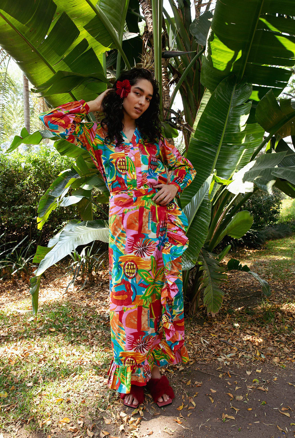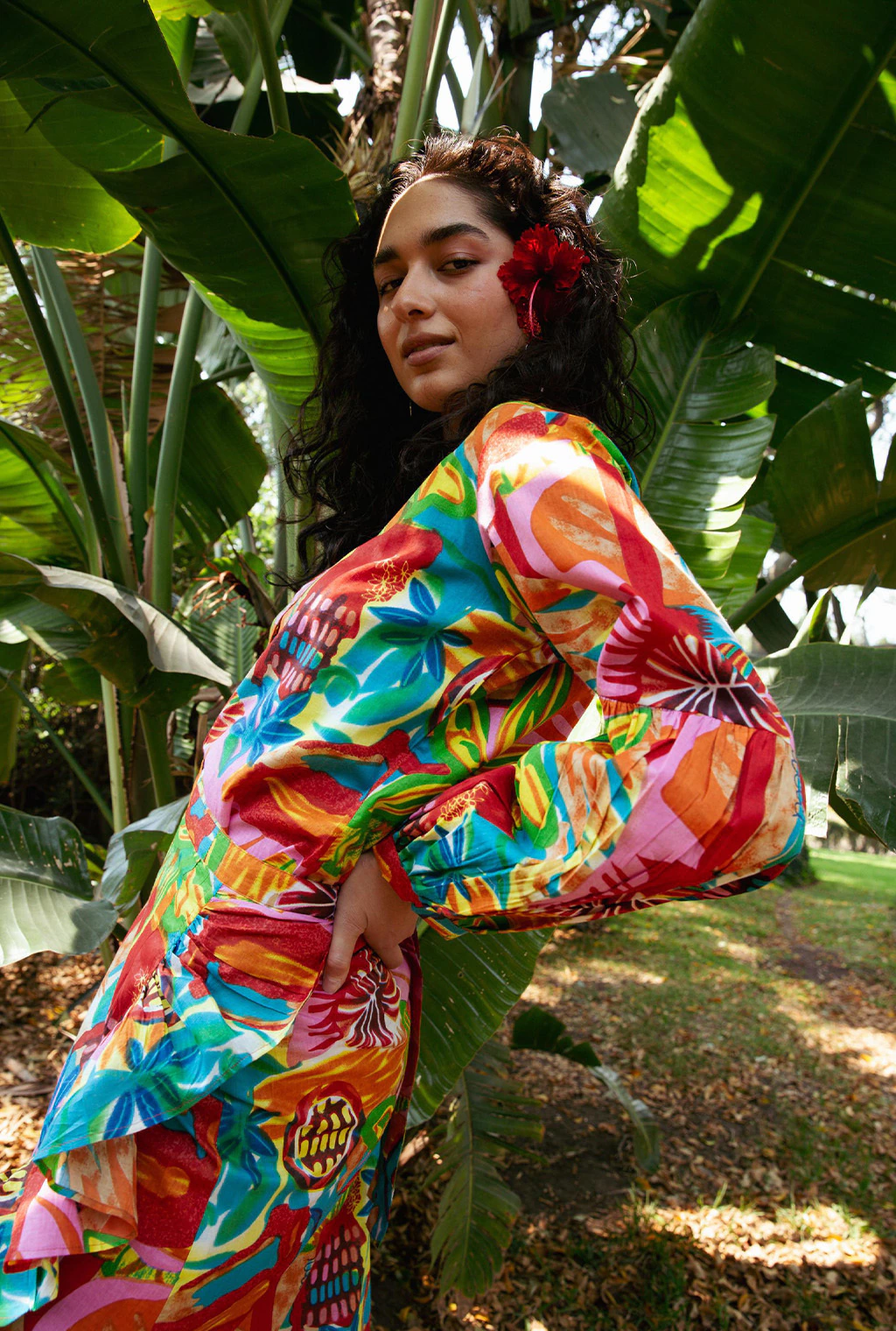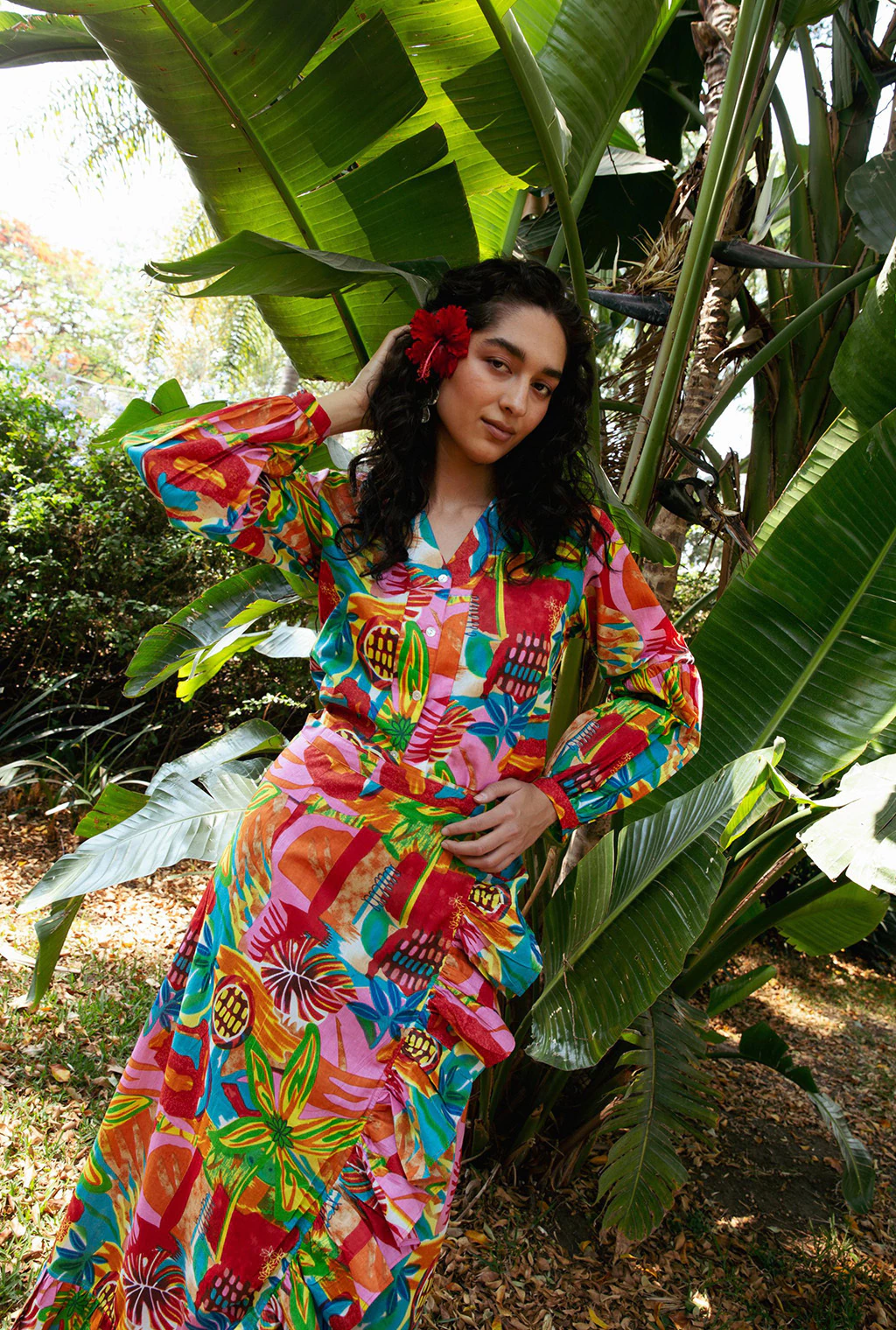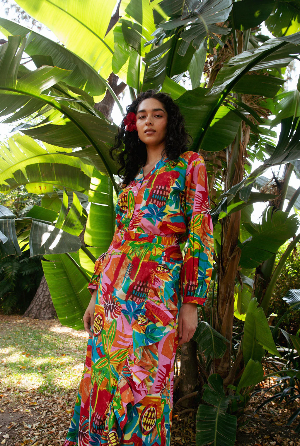Falda envolvente de algodón estampado con un print tropical, con escarola. Se ajusta en la cintura.