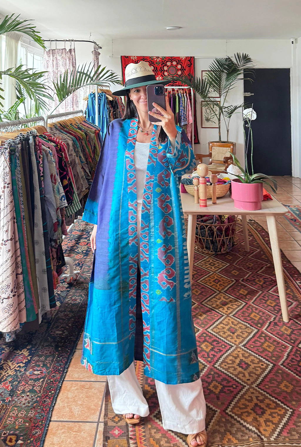 Kimono de seda ikat, una prenda única, y especial con una caída espectacular. Súper ligero, chic y fresco.