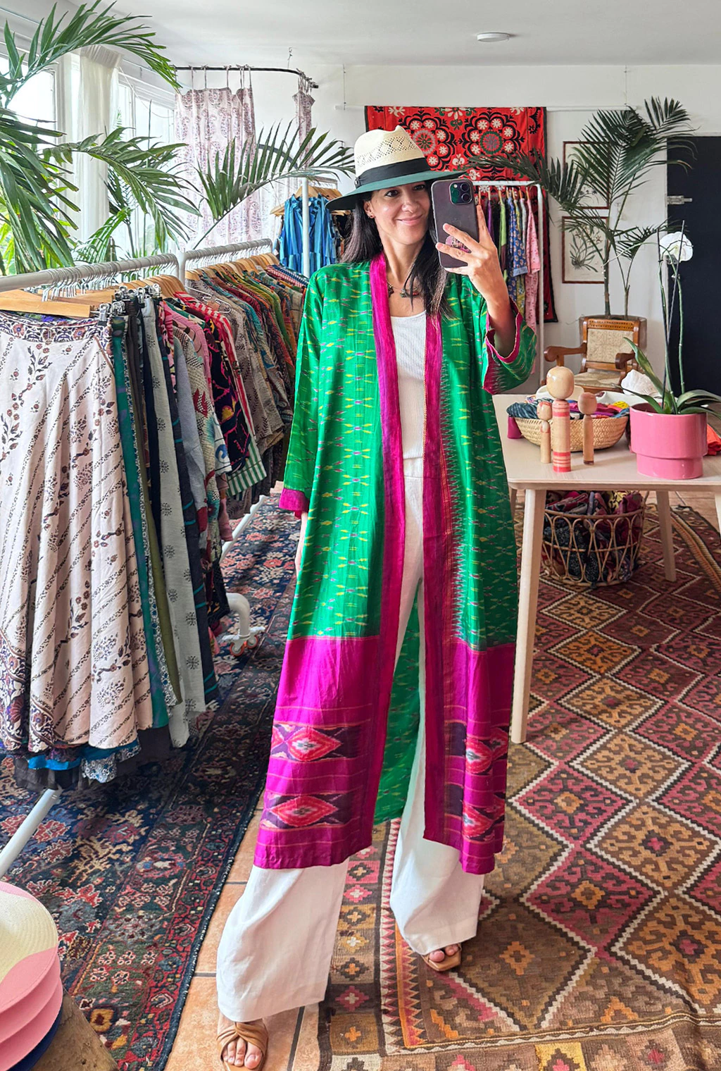 Kimono de seda ikat, una prenda única, y especial con una caída espectacular. Súper ligero, chic y fresco.