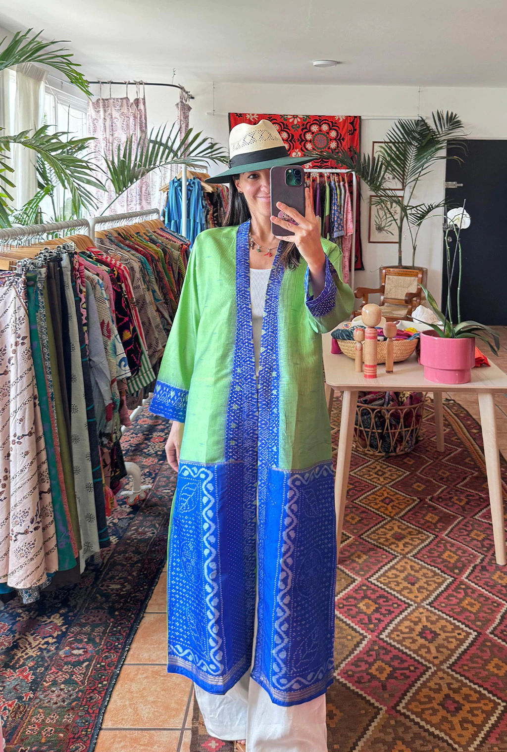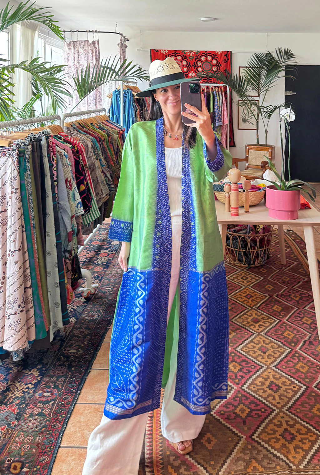 Kimono de seda ikat, una prenda única, y especial con una caída espectacular. Súper ligero, chic y fresco.